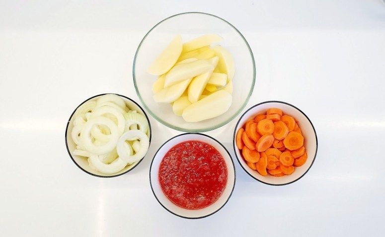 Гародніну нарэзаць на буйныя кавалкі: цыбулю – на паўколцы, моркву – на колцы, бульбу – на дзелькі.