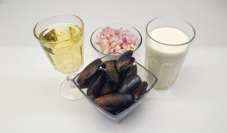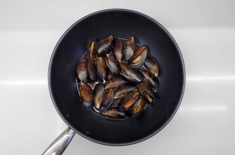 Мідыі абліць кіпенем, стананна прамыць, заліць віном, закіпяціць і варыць пару хвілін (калі закрытыя – аж пакуль не раскрыюцца):