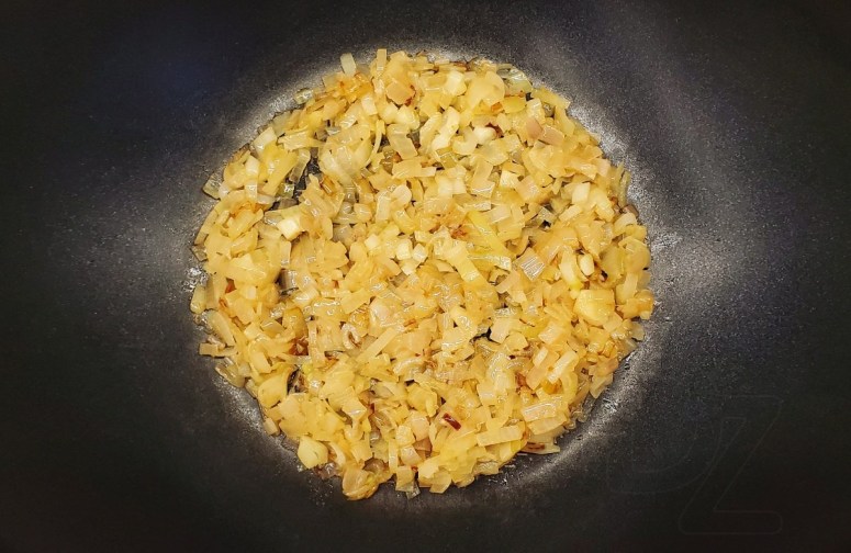 Абсмажыць цыбулю-шалот на сметанковым масле (1 ст. л.) да залацістага: