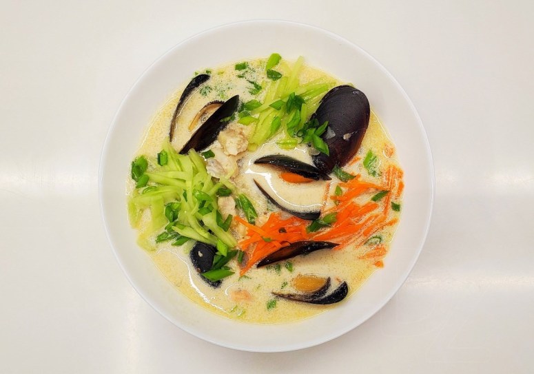 У талерку пакласці мідыі і рыбу, заліць булёнам і пасыпаць гароднінай: