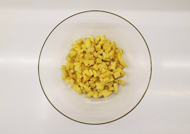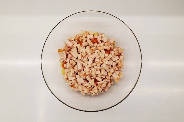 Зелёный горошек нарезать кубиками не надо – просто добавить в салатницу:😉