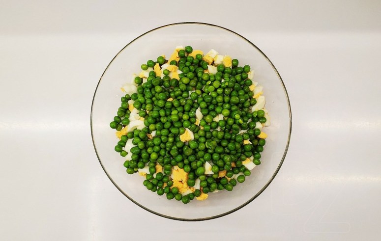 💡Если используется консервированный горошек, жидкостью можно регулировать сочность салата.
