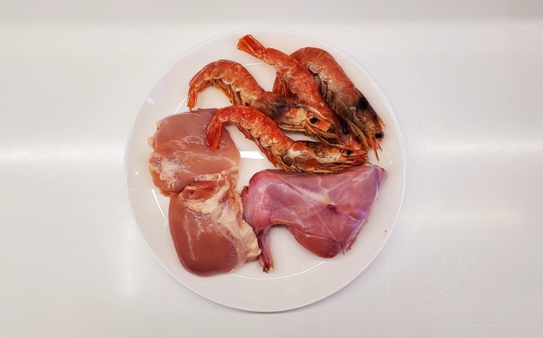 У варыянце ніжэй выкарыстоўваюцца тыгровыя крэветкі плюс лангустыны - мяса курыцы (любое, па жаданні) – 150 г