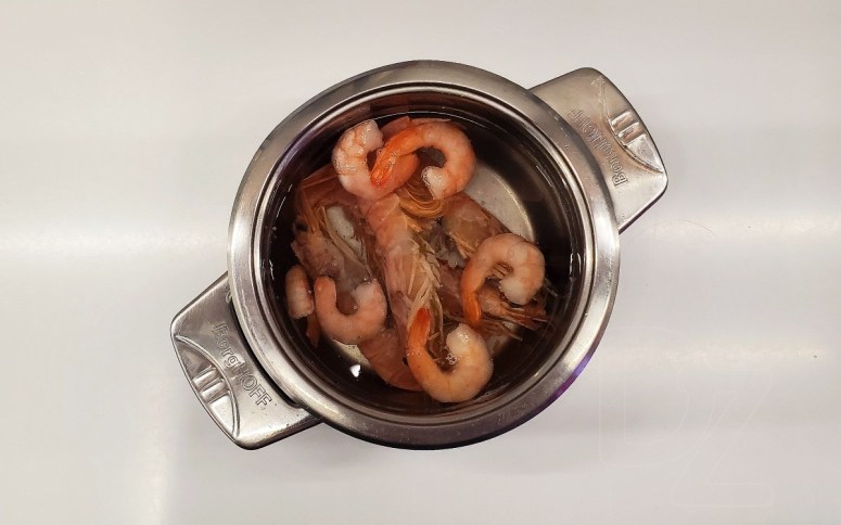 - Калі крэветкі – добра прамыць (можна абварыць кіпенем) і зварыць, не ачышчаючы, у злёгку падсоленай вадзе. Крэветкі дастаць, дробныя – пачысціць.