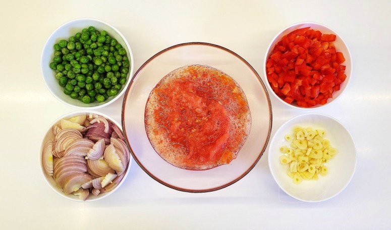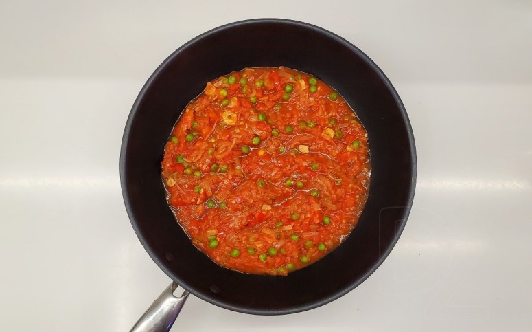Затым пакласці гарошак, фасолю і нацёртыя памідоры. Калі памідоры не вельмі спелыя – дадаць палову сталовай лыжкі таматнай пасты і чайную лыжку цукру.