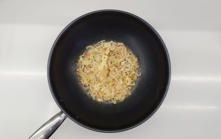 Цыбулю і часнок абсмажыць да празрыстасці. У арыгінале – у тым жа аліўкавым алеі, для яркасці смаку. Калі алею мала – даліць: