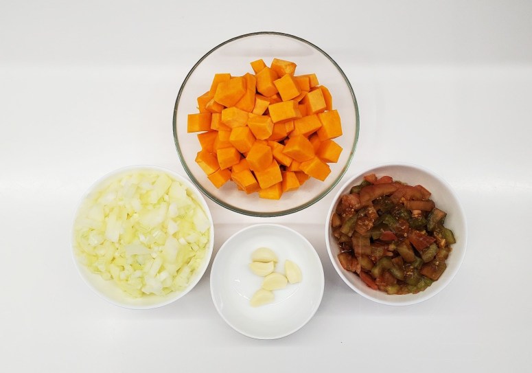 Лук нарезать мелко, очищенную тыкву – небольшими кубиками:
