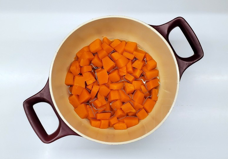 Положить тыкву в подсоленную воду (вода должна почти покрывать тыкву) и варить до полуготовности.