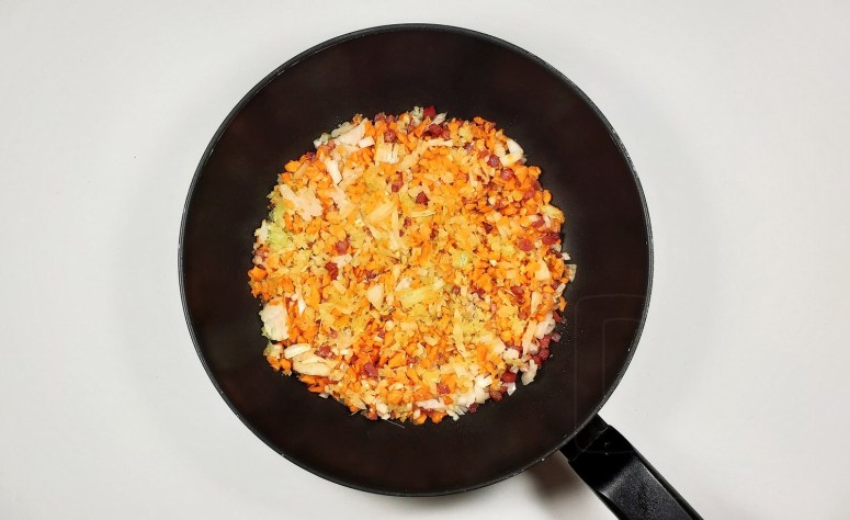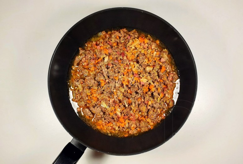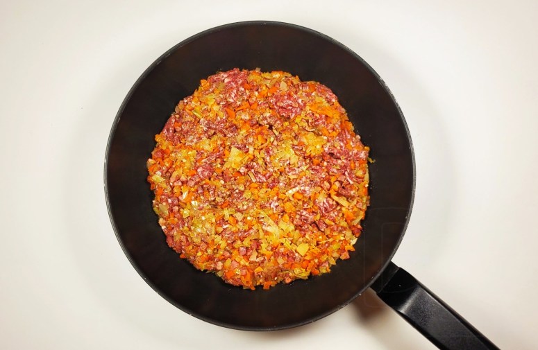 Абсмажваць, старанна разбіваючы камякі, пакуль змесціва не пацямнее: