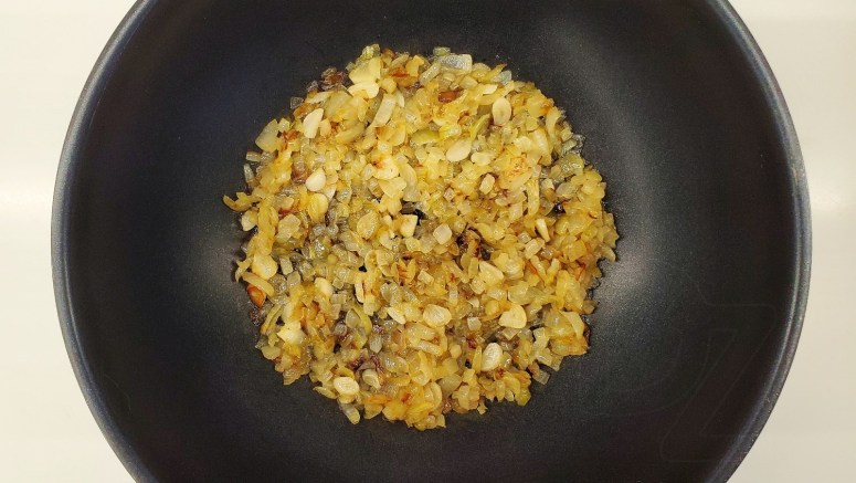 Пасераваць цыбулю з часнаком да залацістага колеру: