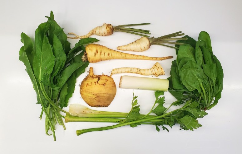 - корань пастэрнаку, салеры, пятрушкі плюс рэпа (не менш за 2-3 кампаненты) – сумарна крыху больш, чым цыбулі