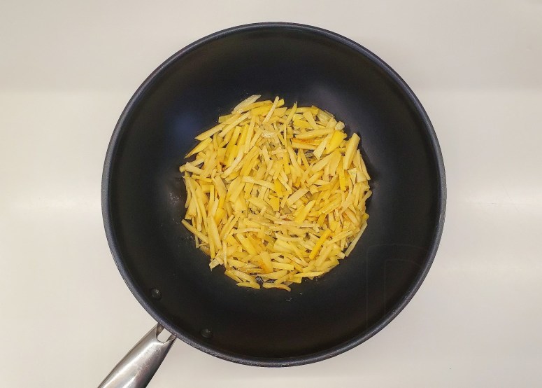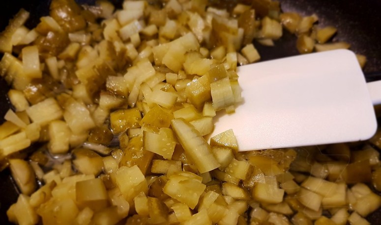 Тым часам салёныя агуркі ачысціць ад скуркі (калі занадта вялікія), парэзаць на кубікі і прыпусціць у невялікай колькасці вады.
