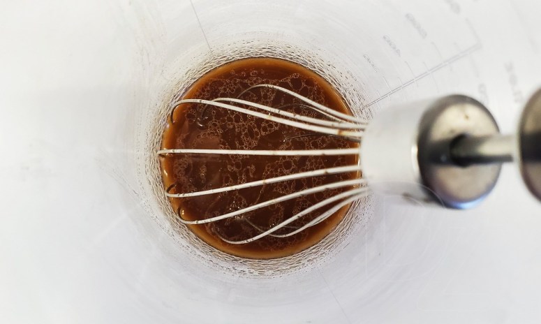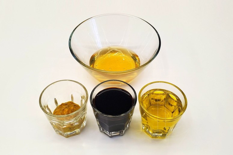 Дадаць мёд і гарчыцу. Старанна вымяшаць.