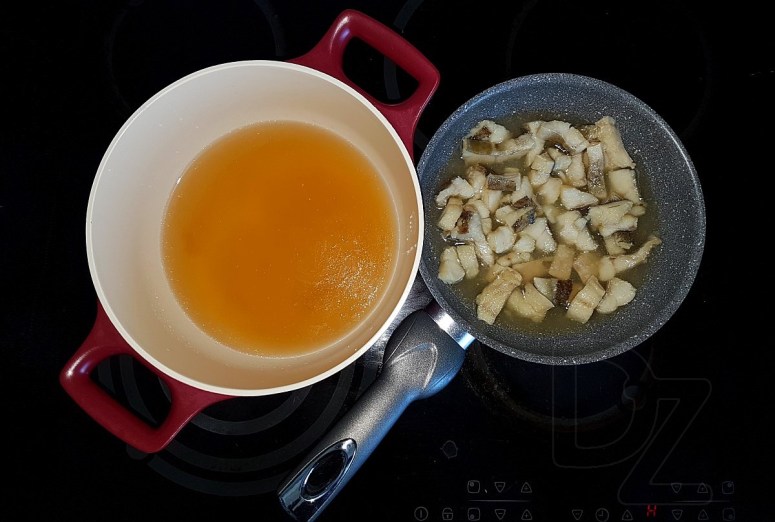 Прыгатаваць моцны булён з галоваў і касцей белай рыбы, з лаўровым лістом, рэпкавай цыбуляй, чорным/духмяным перцам і сухім кропам.
