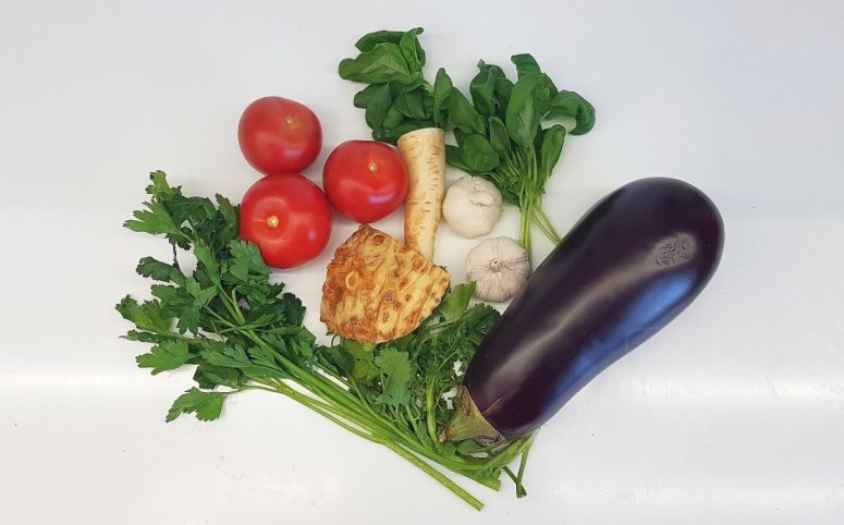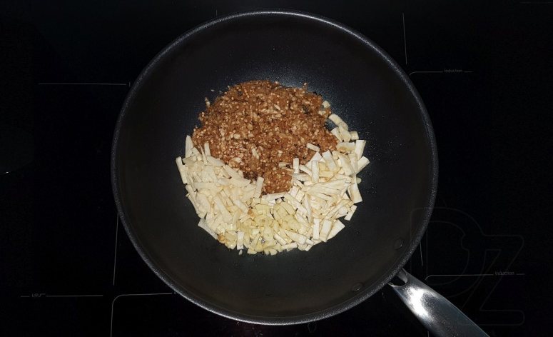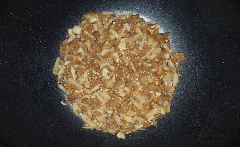 Измельчённую сердцевину баклажанов соединить с чесноком, корнем сельдерея и петрушки: