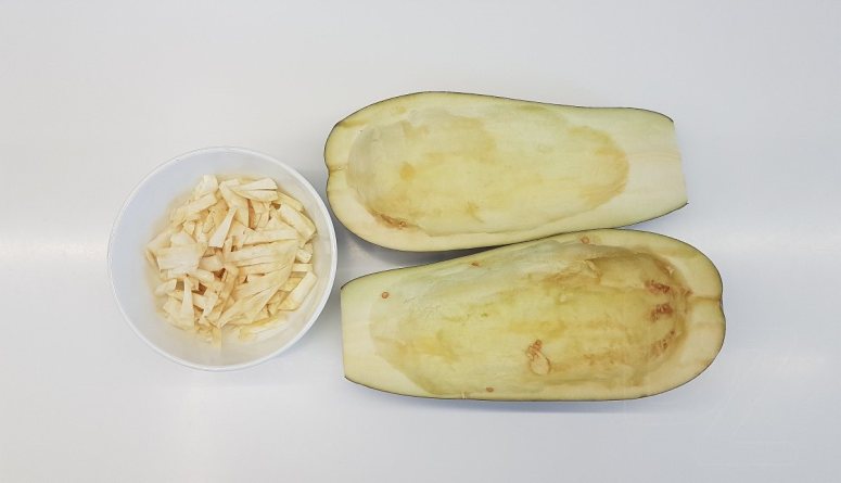Ложкой с острыми краями выскрести сердцевину. Стенки не должны остаться совсем тонкими, иначе готовое блюдо будет разваливаться. Сердцевину измельчить блендером: