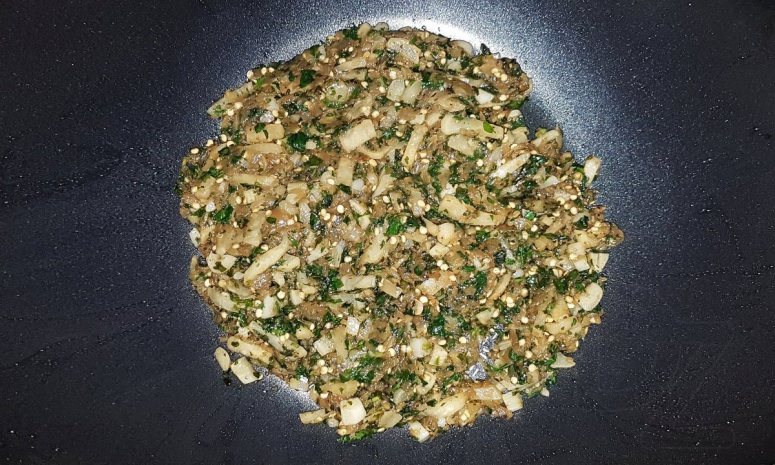 Добавить 1/3 нарубленной зелени, соль, перец, специи и ещё слегка обжарить: