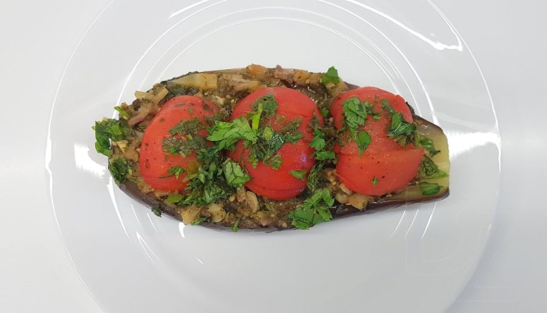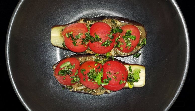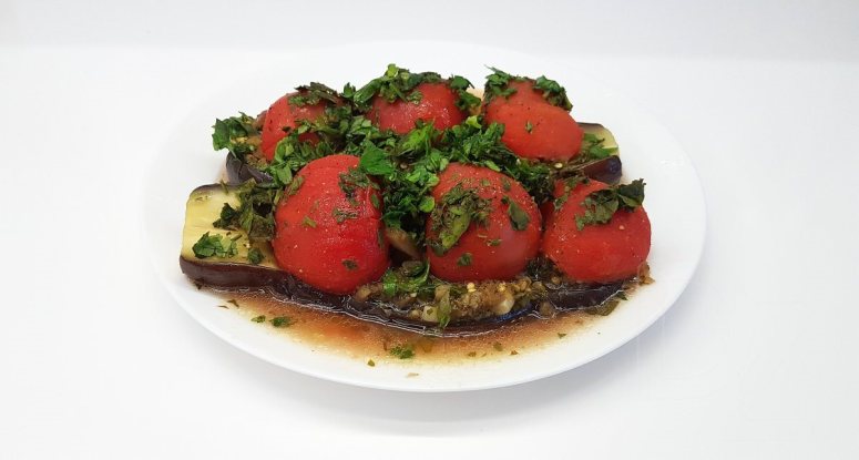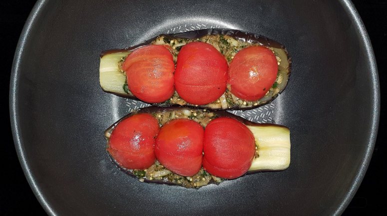 Разложить сверху разрезанные пополам помидоры. Ну или просто напихать обесшкуренные и нарезанные кружками томаты в карман баклажана: