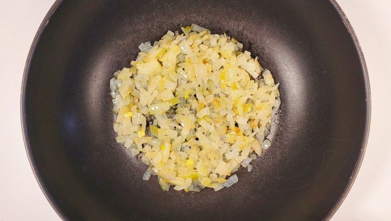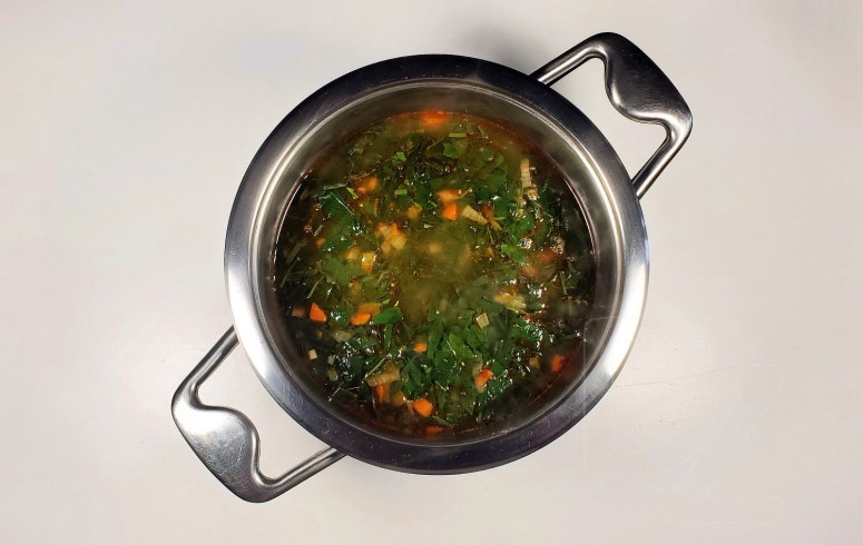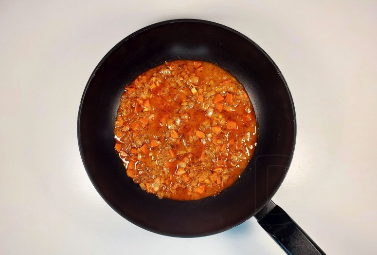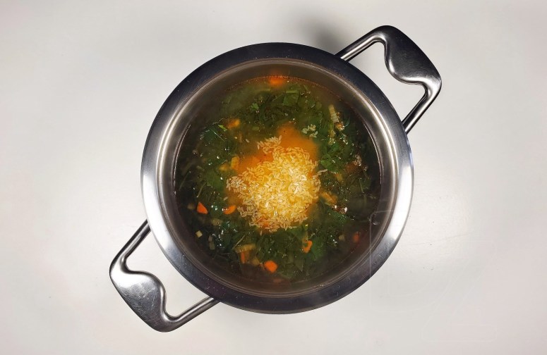 Спалучыць з 1,5 – 1,8 літра гародніннага булёну ці вады (колькасць залежыць ад пажаданай гушчыні):