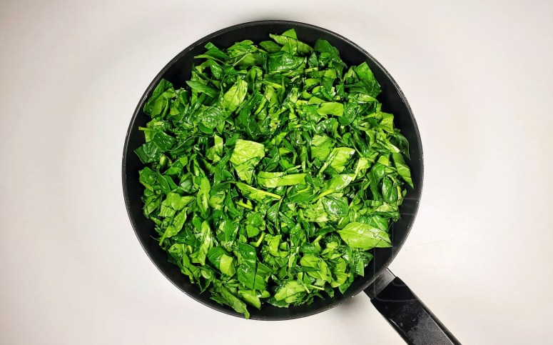 Шпінат нашаткаваць на буйныя кавалкі (сустракаюцца і рэцэпты, у якіх закладваюць лісце цалкам). У скрайнім выпадку дапушчальна выкарыстоўваць замарожаны шпінат.