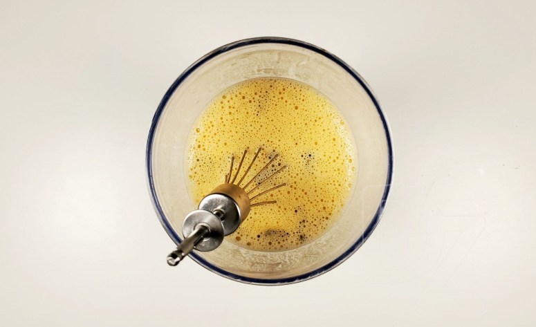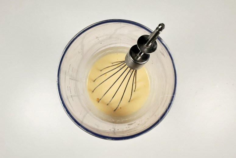 Дадаць крыху вадкасці з супу, каб зраўняць тэмпературу, узбіць: