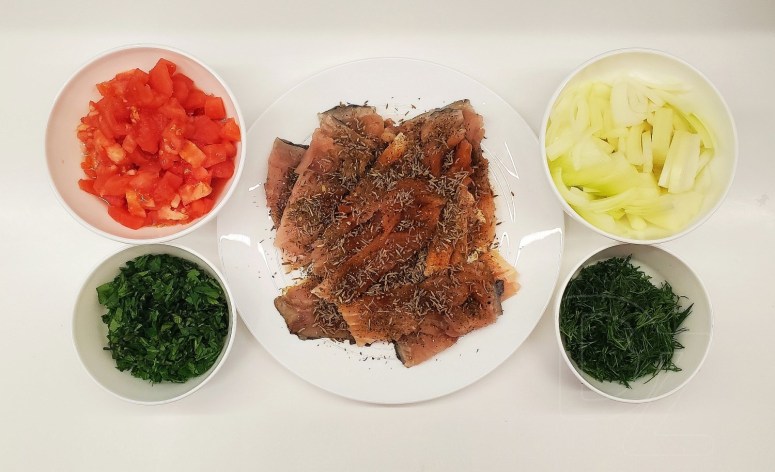 Карпа (калі тушка) нарэзаць упоперак на кавалкі таўшчынёй каля 2 см, нацерці соллю, перцам і спецыямі.