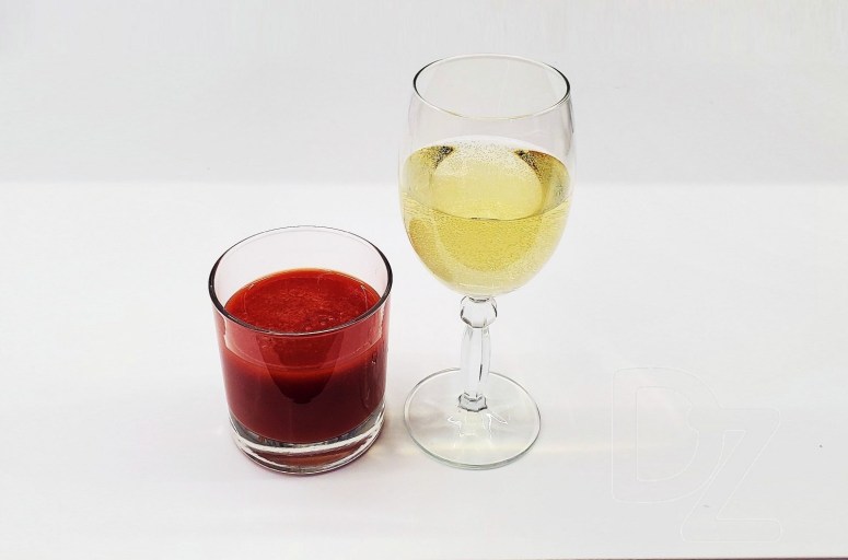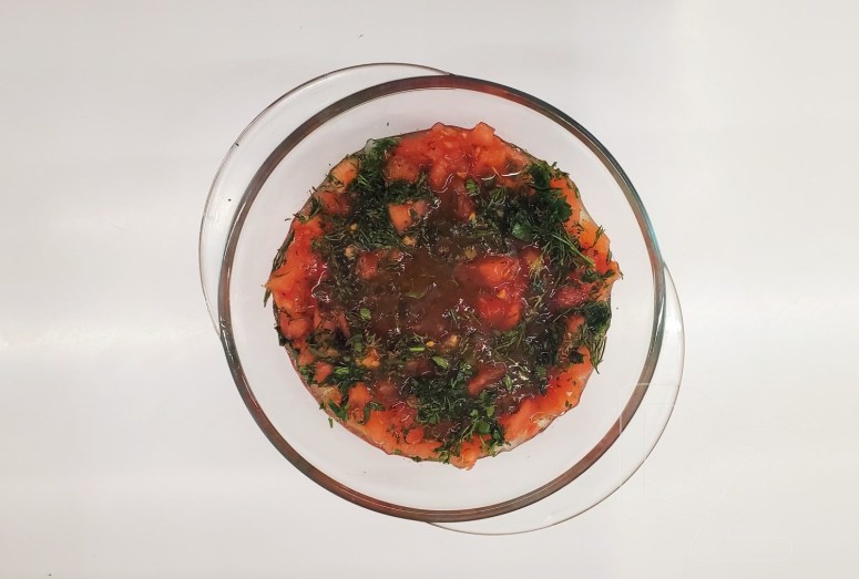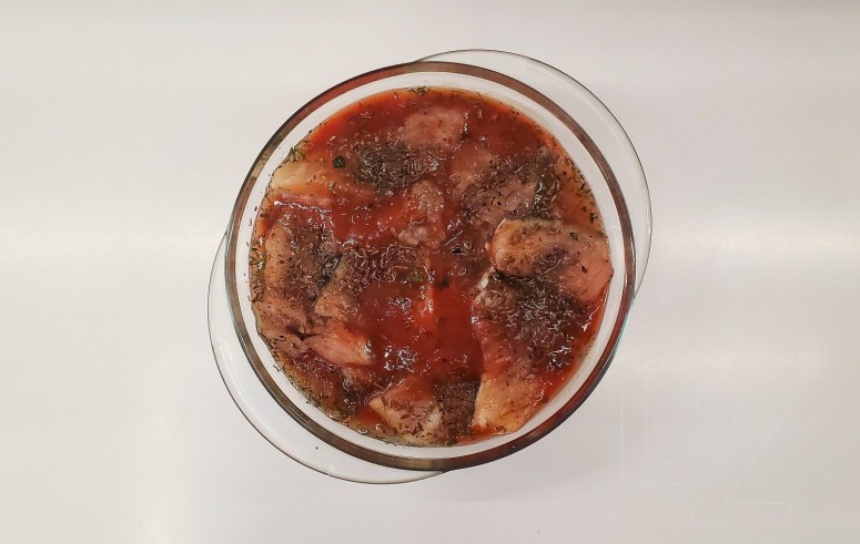 Пакласці зверху кавалкі карпа і заліць таматавым сокам: