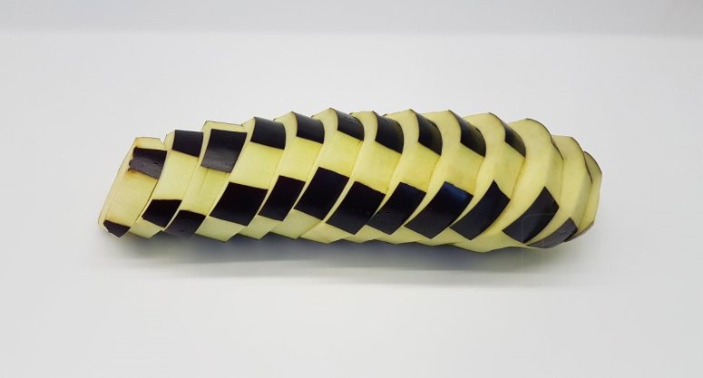 Баклажаны почистить «зеброй» и нарезать толстыми кружочками.