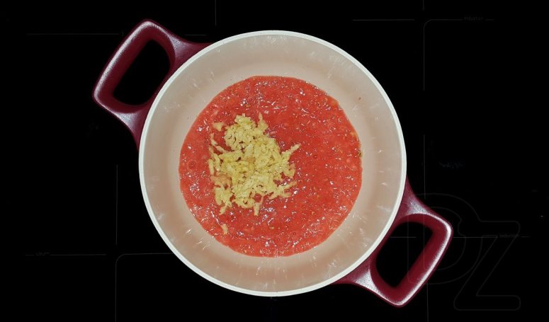 Помидоры измельчить блендером или протереть через сито, добавить измельчённый чеснок: