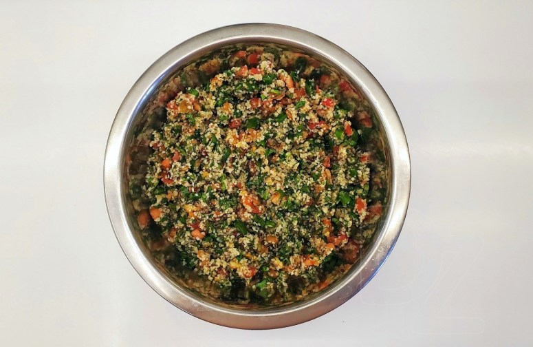 Булгур заліць кіпенем (адзін да паўтара) і пакінуць брыняць на паўгадзіны-гадзіну (залежыць ад памеру булгуру). Павінен быць al dente.