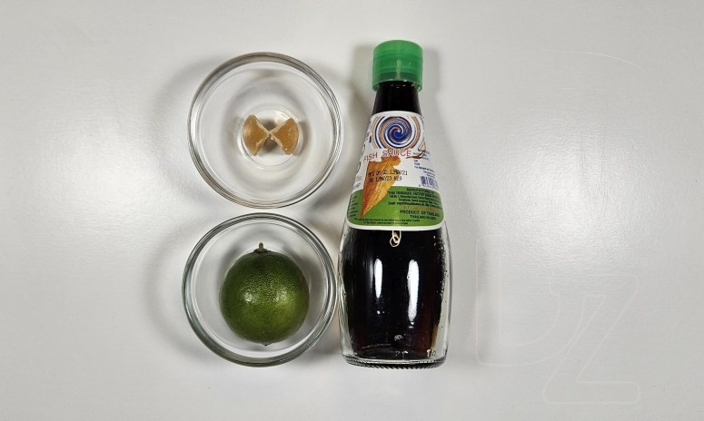 Уліць сталовую лыжку рыбнага соусу, усыпаць палову цукру, выціснуць сок паловы лайма.