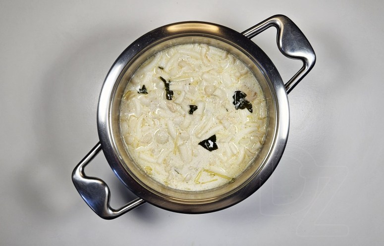 Нам, еўрапейцам, неяк дзіўна не есці ў супе чагосьці, акрамя костак/костачак. Таму найбольш зручны на гэтым этапе для большасці варыянт – дастаць мяса з булёну, пакласці базавыя кампаненты, уліць какосавае малако, паварыць хвілін 5-10 да атрымання пажаданага выніку, а пасля шумоўкай дастаць усе базавыя кампаненты.