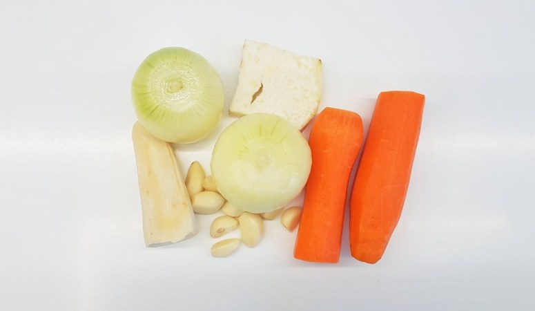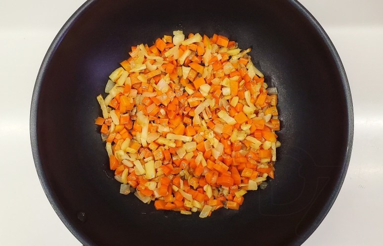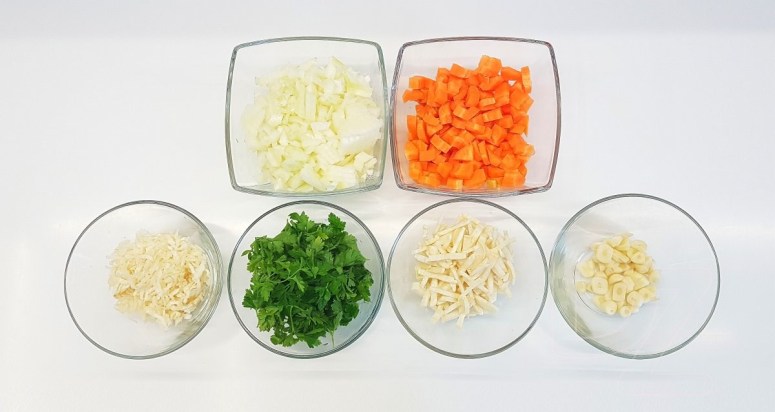 Моркву нарэзаць кубікамі, корань салеры і/альбо пятрушкі нацерці на тарцы ці нарэзаць саломкай.