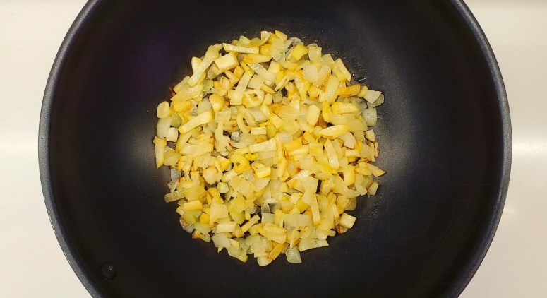 Абсмажыць цыбулю з часнаком, коранем салеры альбо пятрушкі (у арыгінале – на распаленым свіным сале):