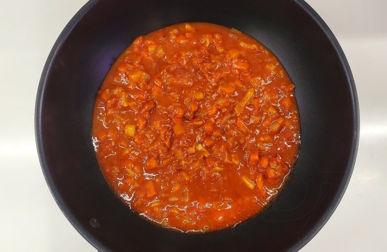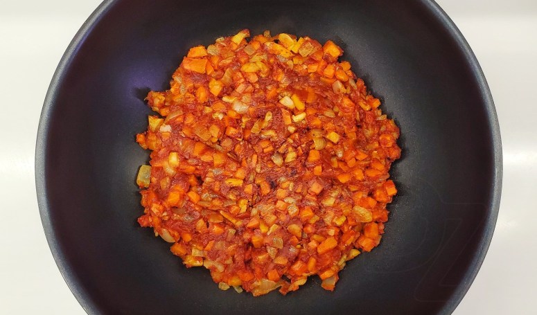 Туды ж – таматавую пасту, абсмажваць яшчэ пару хвілін: