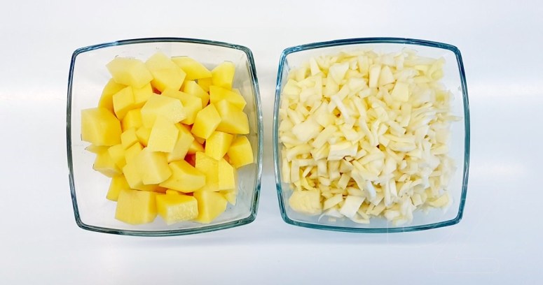 Бульбу нарэзаць кубікамі. Капусту дробна нашаткаваць: