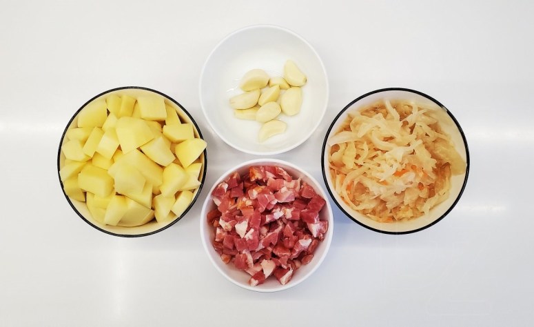 В кастрюле соединить фасоль, картошку, капусту с мясом и лук, выдавить оставшийся чеснок.