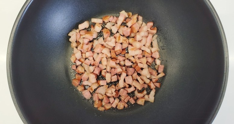 Копчёную свиную грудинку или бекон обжарить до золотистого: