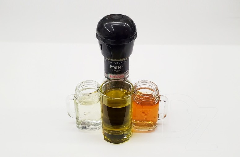 У аліўкавы алей дадаць воцаты, свежамолаты перац, соль і цукар: