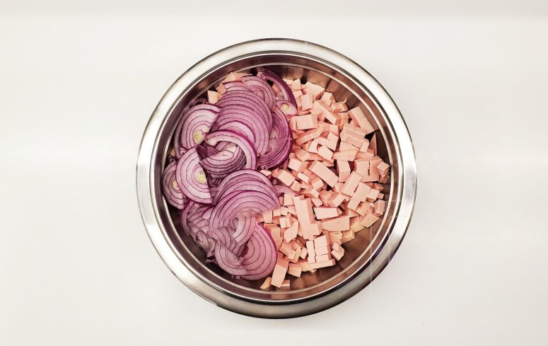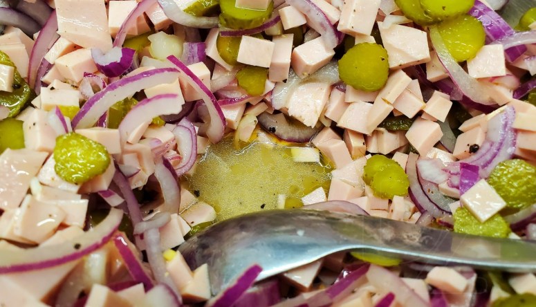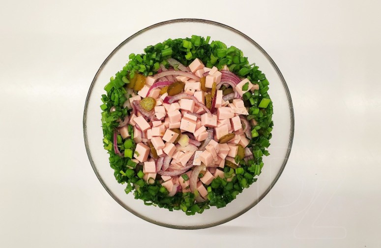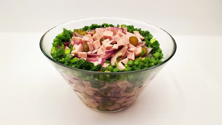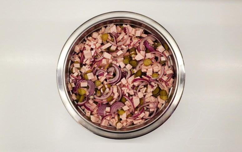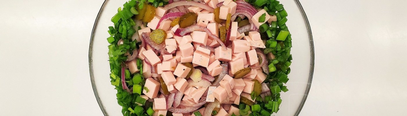 Гатуем «Bayerischer Wurstsalat» – Баварскую мясную салату, – выкарыстоўваючы кілбасу «Как раньше»😉: