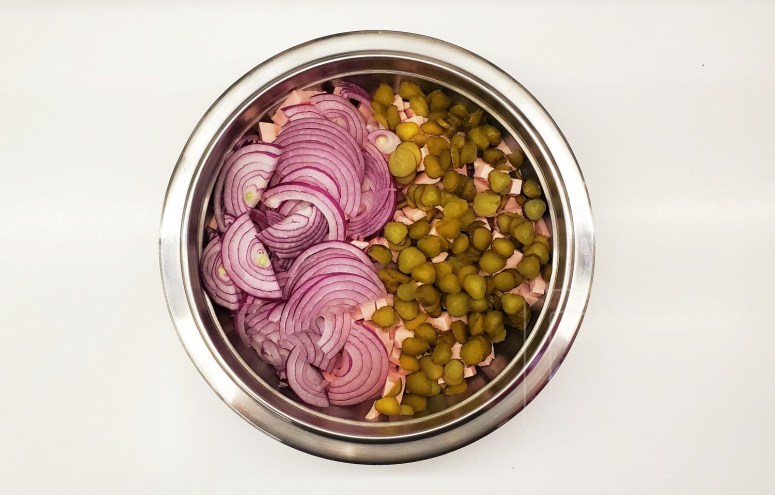Агуркі/карнішоны нарэзаць на тонкія пласцінкі (невялікія) і таксама адправіць да кілбасы:
