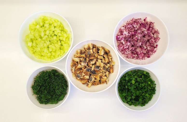 Селядзец і агуркі нарэзаць на дробныя кубікі.